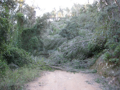 En una curva a izquierdas de la pista, tengo que seguir recto por un sendero que sube poco a poco por unos bancales, que pronto me enseñan los verdaderos efectos del huracán de ayer, ahora creo que se le puede denominar así, una vez visto los efectos devastadores que ha provocado en el Baix Llobregat.
